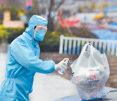重慶部分火鍋企業(yè)在重慶市商務(wù)委和相關(guān)部門的指導(dǎo)下,為消費(fèi)者提供零接觸火鍋外賣服務(wù)。圖為重慶一家火鍋店的配送人員在消費(fèi)者來取外賣之前對包裝袋進(jìn)行消毒。新華社記者 王全超攝