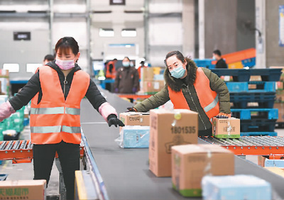 近日,位于北京市順義區(qū)的菜鳥物流倉庫在做好疫情防控的同時,穩(wěn)步有序復(fù)工復(fù)產(chǎn)。該物流倉庫目前每天處理訂單近5萬件,生產(chǎn)運營基本恢復(fù)到日常水平。圖為3月12日,在順義區(qū)菜鳥物流倉庫,幾名員工在分揀打包的商品。