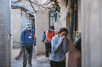 3月12日,任國慶(圖左)和搭檔來到前門大江社區一院落噴灑消毒液。