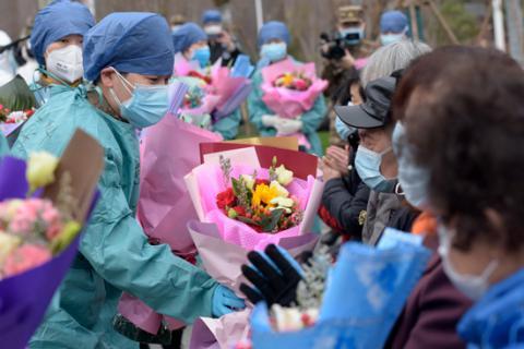 醫護人員祝?;颊叱鲈骸7讹@海/攝