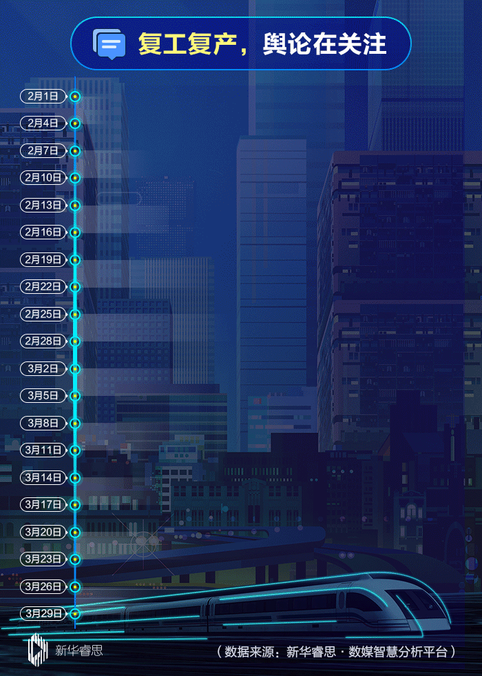 對(duì)網(wǎng)上“復(fù)工復(fù)產(chǎn)”相關(guān)話題的信息量和關(guān)注熱度,新華睿思持續(xù)跟蹤,自2月初至3月28日統(tǒng)計(jì)總量已達(dá)2784萬(wàn)條,網(wǎng)民的關(guān)注度不斷攀升。