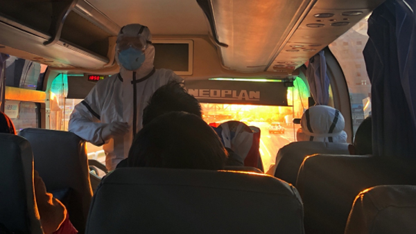 6、抵達:17:45,專列抵達北京西站,乘客根據指引到所在區的集合地點集合,統一前往區里安排的分流地點。記者乘坐豐臺區組織的大巴,前往豐臺體育中心。