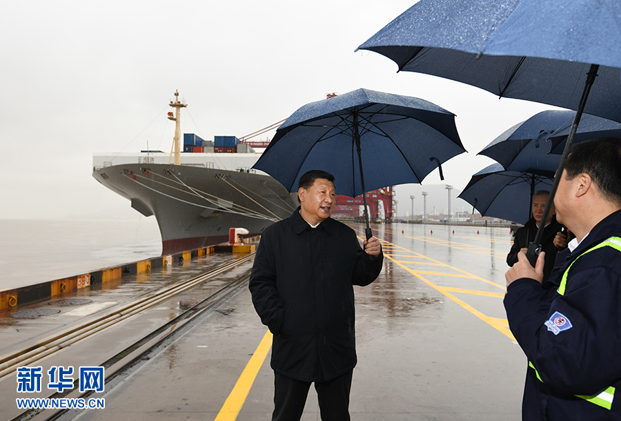 3月29日,中共中央總書記、國家主席、中央軍委主席習近平在浙江考察調研。這是習近平在寧波舟山港穿山港區碼頭了解港口復工復產情況。 新華社記者 燕雁 攝