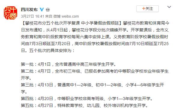 此外,四川攀枝花市教育和體育局近日也發(fā)布通知,從4月1日起,攀枝花分學(xué)段分批次錯(cuò)峰開學(xué)。開學(xué)復(fù)課后,全市義務(wù)教育和高中階段教育學(xué)校每周六集中安排上課。義務(wù)教育階段學(xué)校暑假放假時(shí)間由7月3日順延至7月20日,高中階段學(xué)校暑假放假時(shí)間由7月10日順延至7月25日。