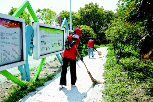 ▲4月9日,南潯區石淙鎮志愿者在花園灣村進行衛生大掃除。?新華社記者黃宗治攝