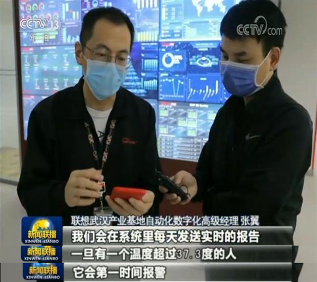 這里是聯(lián)想武漢產(chǎn)業(yè)基地,目前復(fù)工復(fù)產(chǎn)率已達(dá)到100%,所有返崗員工都需持有健康證明,在工作區(qū)域每隔4小時(shí)就有網(wǎng)格員來(lái)測(cè)量體溫。此外,企業(yè)還專門開發(fā)了數(shù)字化防疫系統(tǒng),對(duì)在崗員工健康狀況進(jìn)行精準(zhǔn)管理。