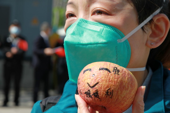 4月12日,北京協和醫療隊所負責的ICU患者清零,張媛媛松了一口氣,此時從北京帶來的蘋果已經枯萎皺皮,她便在上面畫了一張笑臉,寫下“勝利”二字。她說,能夠把這個蘋果帶回家,意味著隊伍平安返京,而作為堅守到最后的醫療隊,她們的撤離標志著武漢的抗疫工作獲得了重大階段性勝利。