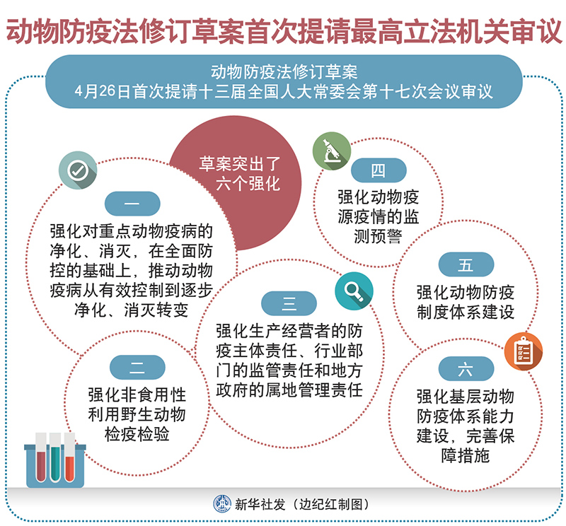 草案突出了六個強化:一是強化對重點動物疫病的凈化、消滅,在全面防控的基礎上,推動動物疫病從有效控制到逐步凈化、消滅轉變;二是強化非食用性利用野生動物檢疫檢驗;三是強化生產經營者的防疫主體責任、行業部門的監管責任和地方政府的屬地管理責任;四是強化動物疫源疫情的監測預警;五是強化動物防疫制度體系建設;六是強化基層動物防疫體系能力建設,完善保障措施。