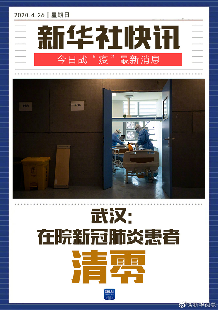 當(dāng)日下午在北京舉行的國(guó)務(wù)院聯(lián)防聯(lián)控機(jī)制新聞發(fā)布會(huì)上,國(guó)家衛(wèi)生健康委新聞發(fā)言人米鋒也介紹說(shuō),經(jīng)過(guò)武漢和全國(guó)援鄂醫(yī)務(wù)人員的共同努力,至26日,武漢在院新冠肺炎患者清零。