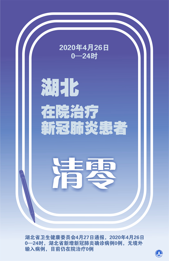 新華社武漢4月27日電(記者廖君、馮國棟)據湖北省衛生健康委員會27日通報,2020年4月26日0—24時,湖北省新增新冠肺炎確診病例0例,無境外輸入病例。