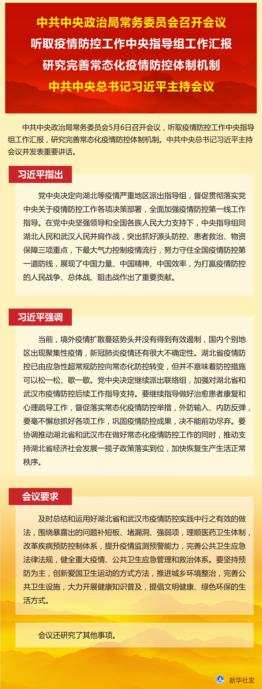 新華社北京5月6日電 中共中央政治局常務委員會5月6日召開會議,聽取疫情防控工作中央指導組工作匯報,研究完善常態化疫情防控體制機制。中共中央總書記習近平主持會議并發表重要講話。