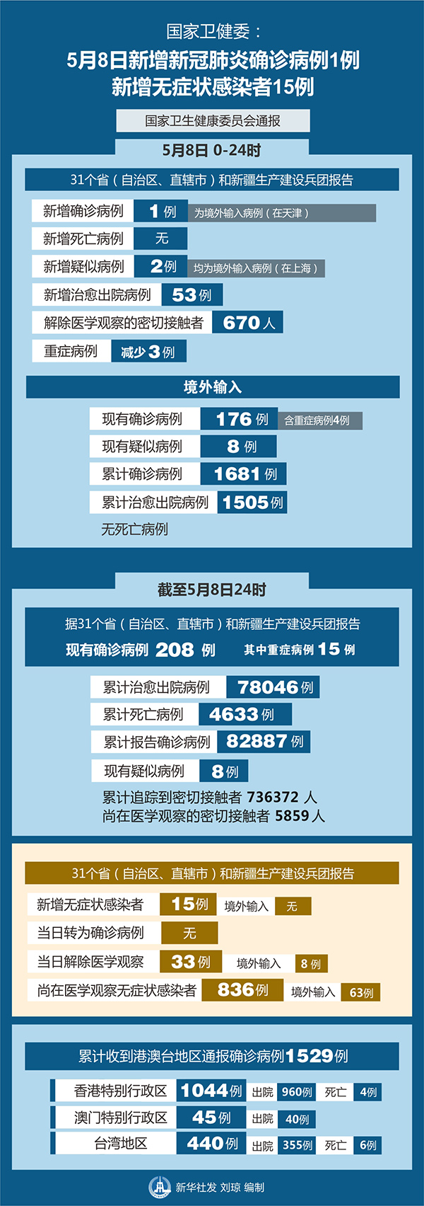 截至5月8日24時,據(jù)31個省(自治區(qū)、直轄市)和新疆生產(chǎn)建設兵團報告,現(xiàn)有確診病例208例(其中重癥病例15例),累計治愈出院病例78046例,累計死亡病例4633例,累計報告確診病例82887例,現(xiàn)有疑似病例8例。累計追蹤到密切接觸者736372人,尚在醫(yī)學觀察的密切接觸者5859人。