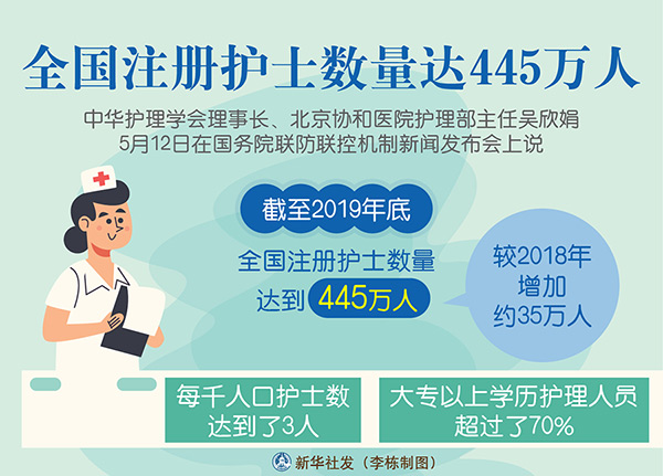 新華社北京5月12日電(記者王優(yōu)玲、王秉陽)中華護理學會理事長、北京協(xié)和醫(yī)院護理部主任吳欣娟12日在國務院聯(lián)防聯(lián)控機制新聞發(fā)布會上說,截至2019年底,全國注冊護士數(shù)量達到445萬人,較2018年增加約35萬人。每千人口護士數(shù)達到了3人,大專以上學歷護理人員超過了70%。
