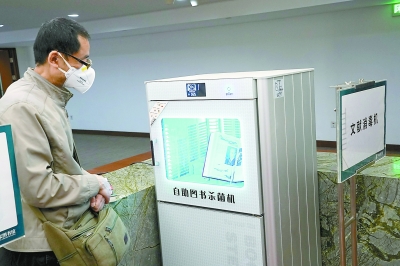 讀者利用自助圖書消毒設備為書籍消毒。記者 李洋