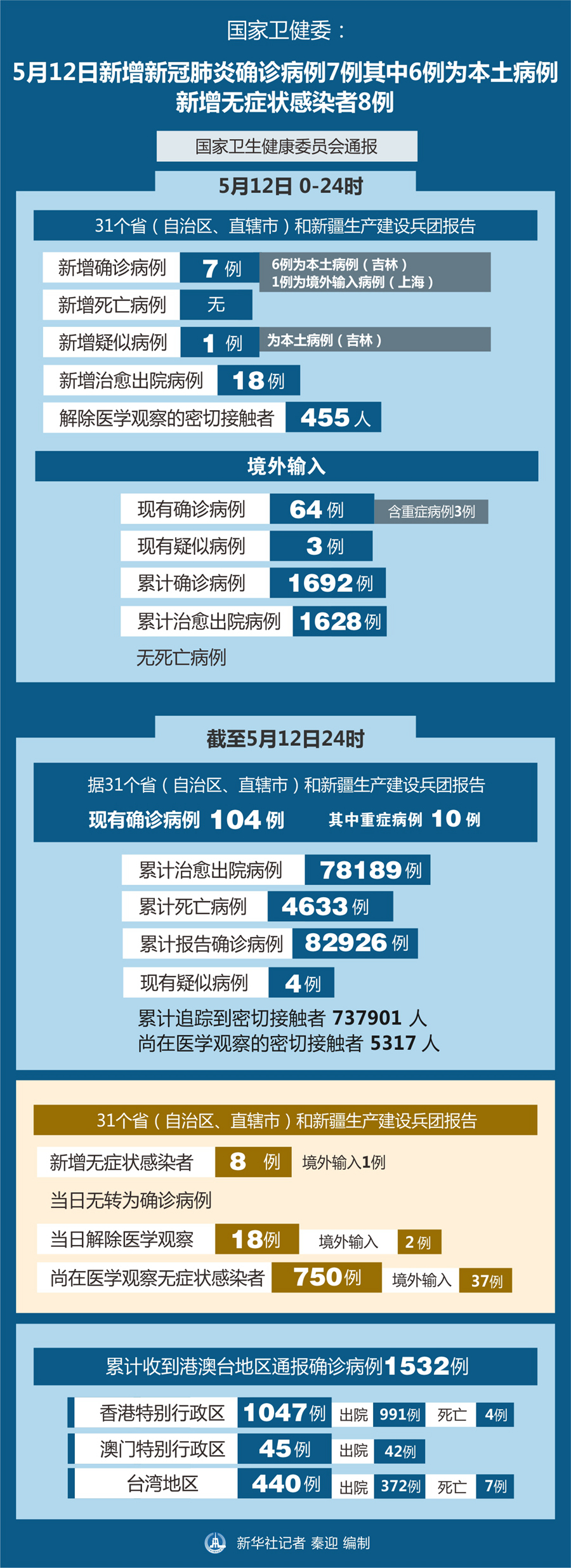 新華社北京5月13日電(記者溫競華、王雨蕭)國家衛健委13日通報,5月12日0-24時,31個?。ㄗ灾螀^、直轄市)和新疆生產建設兵團報告新增新冠肺炎確診病例7例,其中6例為本土病例(均在吉林),1例為境外輸入病例(在上海);無新增死亡病例;新增疑似病例1例,為本土病例(在吉林)。
