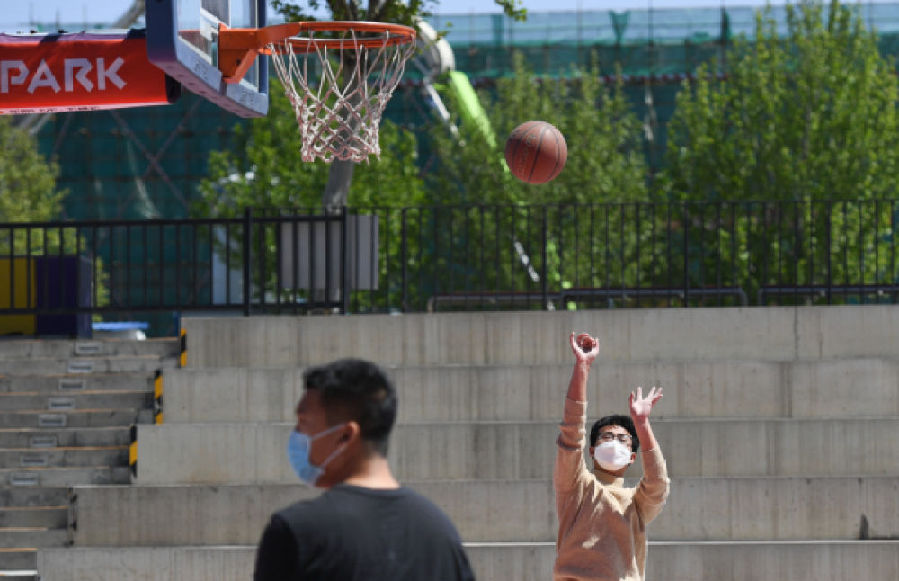 4月22日,市民通過實名預約場地,在北京市五棵松籃球公園室外球場打球 鞠煥宗/攝