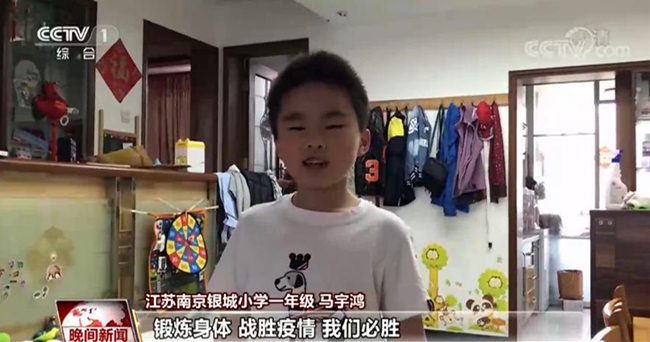 江蘇南京銀城小學一年級 馬宇鴻:在家我學到了一些新技能。前滾翻、雙手拍籃球、玩橢圓機……鍛煉身體,戰勝疫情,我們必勝!