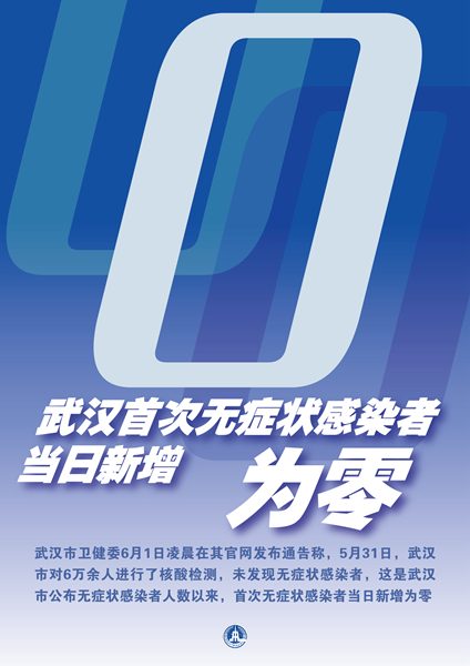 新華社武漢6月1日電 武漢市衛健委6月1日凌晨在其官網發布通告稱,5月31日,武漢市對6萬余人進行了核酸檢測,未發現無癥狀感染者,這是武漢市公布無癥狀感染者人數以來,首次無癥狀感染者當日新增為零。