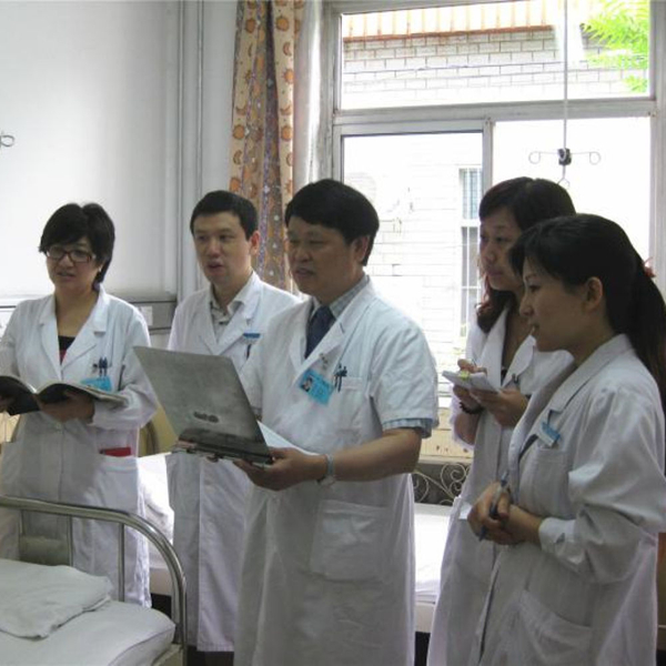 中國醫學科學院腫瘤醫院徐兵河教授(右三)、馬飛教授(右四)攜治療團隊在病房查問病人康復情況。(圖片由受訪者提供)