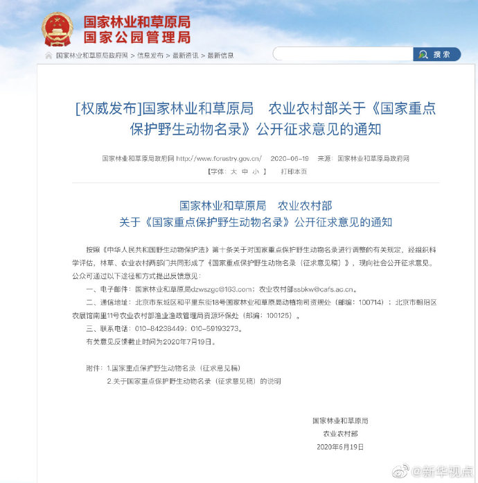 這些調整你同意嗎?公眾可通過以下途徑和方式提出反饋意見:一、電子郵件:國家林業(yè)和草原局dzwszgc@163.com;農業(yè)農村部ssbkw@cafs.ac.cn。二、通信地址:北京市東城區(qū)和平里東街18號國家林業(yè)和草原局動植物司資規(guī)處(郵編:100714);北京市朝陽區(qū)農展館南里11號農業(yè)農村部漁業(yè)漁政管理局資源環(huán)保處(郵編:100125)。三、聯系電話:010-84238449;010-59193273。有關意見反饋截止時間為2020年7月19日。(記者胡璐)