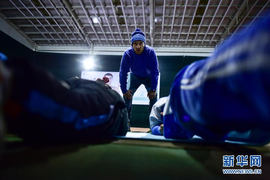 在青海省海東市互助土族自治縣的網(wǎng)球場內(nèi),喬西·羅賓遜帶領(lǐng)學員進行拉伸運動(2019年11月7日攝)。 新華社記者吳剛攝