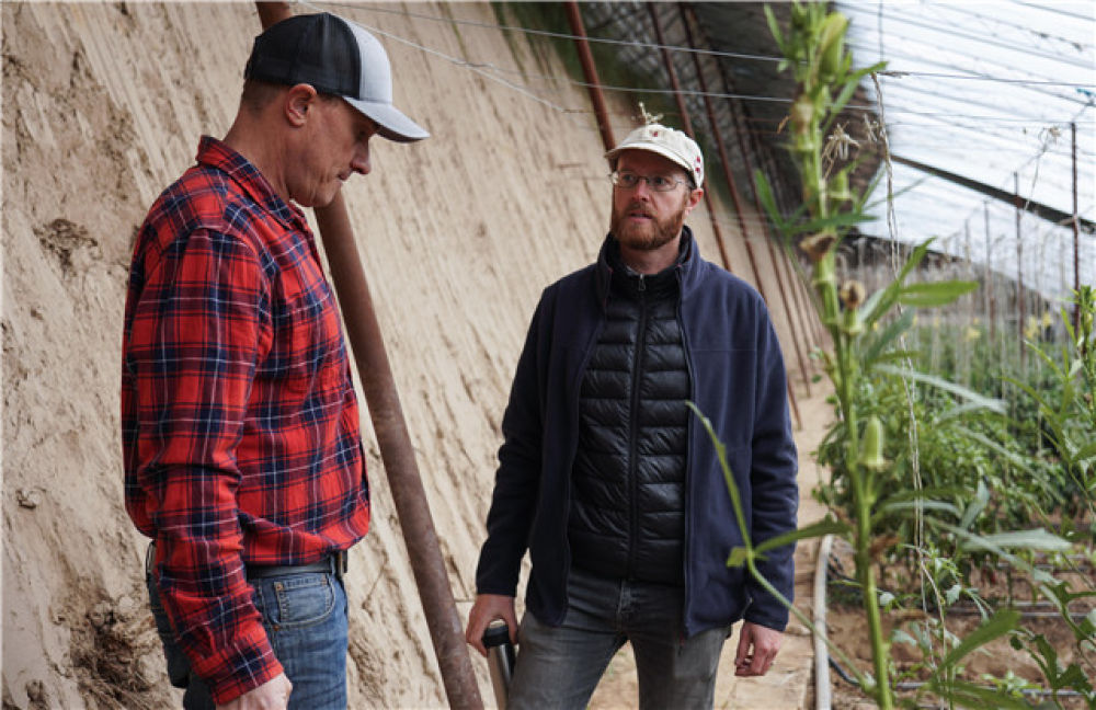 摩根(左)和丹尼爾在西寧市總寨塬高原型現代都市農業科技示范園的蔬菜大棚內聊天(2019年11月12日攝)。新華社記者 吳剛 攝