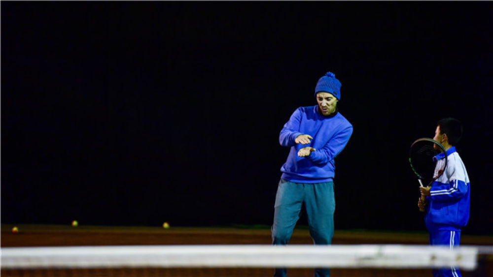 在青海省海東市互助土族自治縣的網球場內,喬西·羅賓遜(左)在指導學員發球(2019年11月7日攝)。新華社記者 吳剛 攝