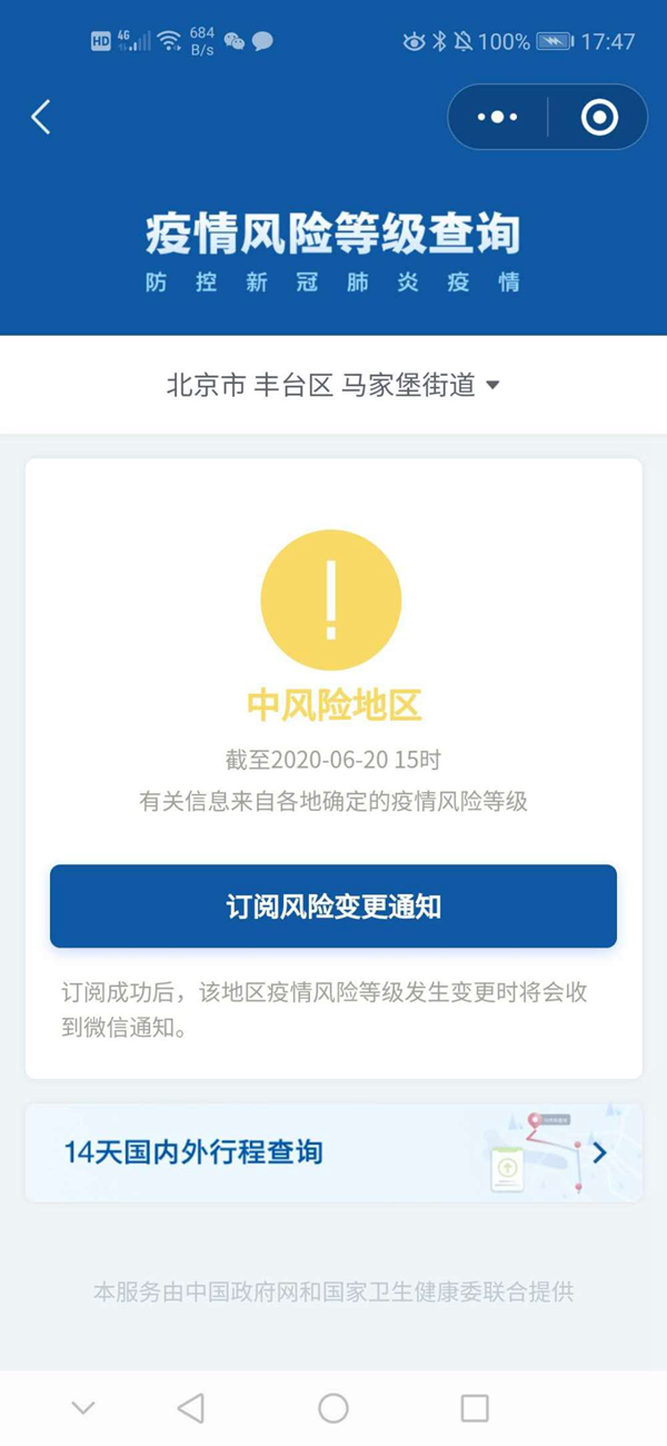 記者從國務(wù)院客戶端小程序“疫情風(fēng)險等級查詢”上了解到,截至6月20日15時,北京豐臺馬家堡街道升級為中風(fēng)險地區(qū)。