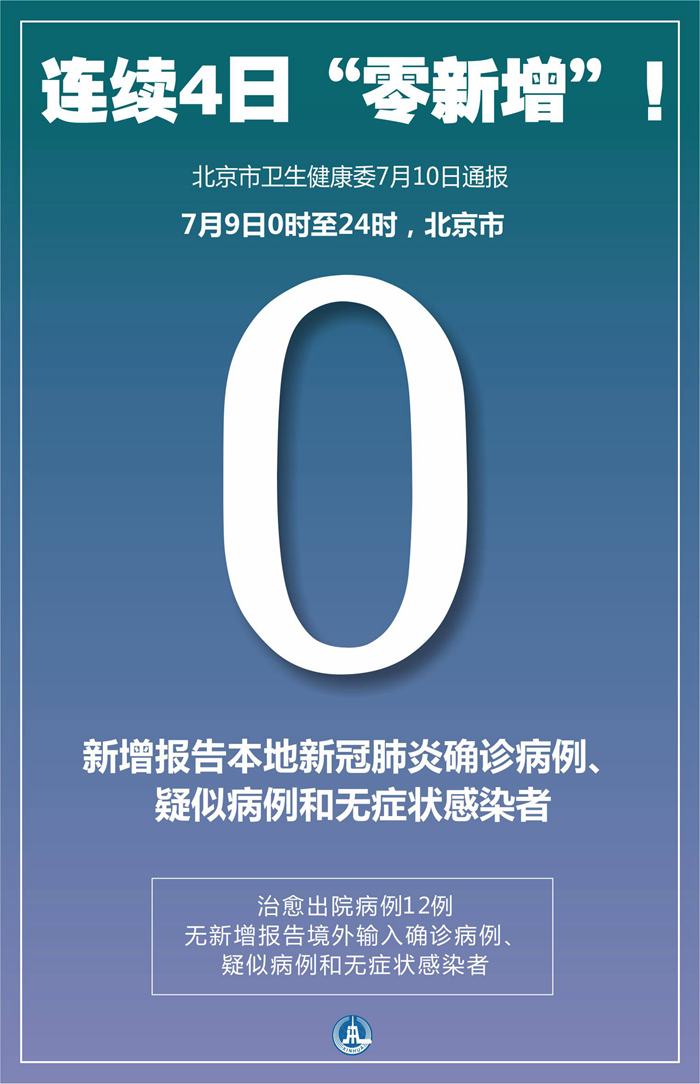 新華社北京7月10日電(記者俠克)北京市衛生健康委10日通報,7月9日0時至24時,北京市無新增報告本地新冠肺炎確診病例、疑似病例和無癥狀感染者,治愈出院病例12例;無新增報告境外輸入確診病例、疑似病例和無癥狀感染者。