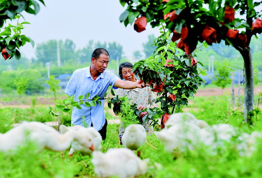 6月11日,李健(左)在桐柏縣埠江鎮付樓村黃金梨種植基地查看黃金梨套袋情況。本報記者郝源攝