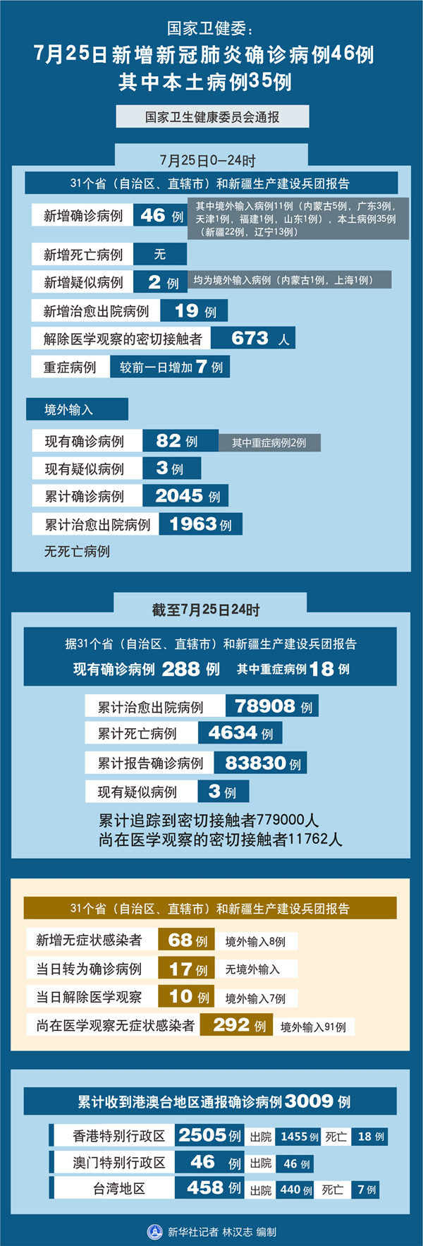 新華社北京7月26日電 國(guó)家衛(wèi)生健康委員會(huì)26日通報(bào),7月25日0-24時(shí),31個(gè)省(自治區(qū)、直轄市)和新疆生產(chǎn)建設(shè)兵團(tuán)報(bào)告新增新冠肺炎確診病例46例,其中境外輸入病例11例(內(nèi)蒙古5例,廣東3例,天津1例,福建1例,山東1例),本土病例35例(新疆22例,遼寧13例);無(wú)新增死亡病例;新增疑似病例2例,均為境外輸入病例(內(nèi)蒙古1例,上海1例)。