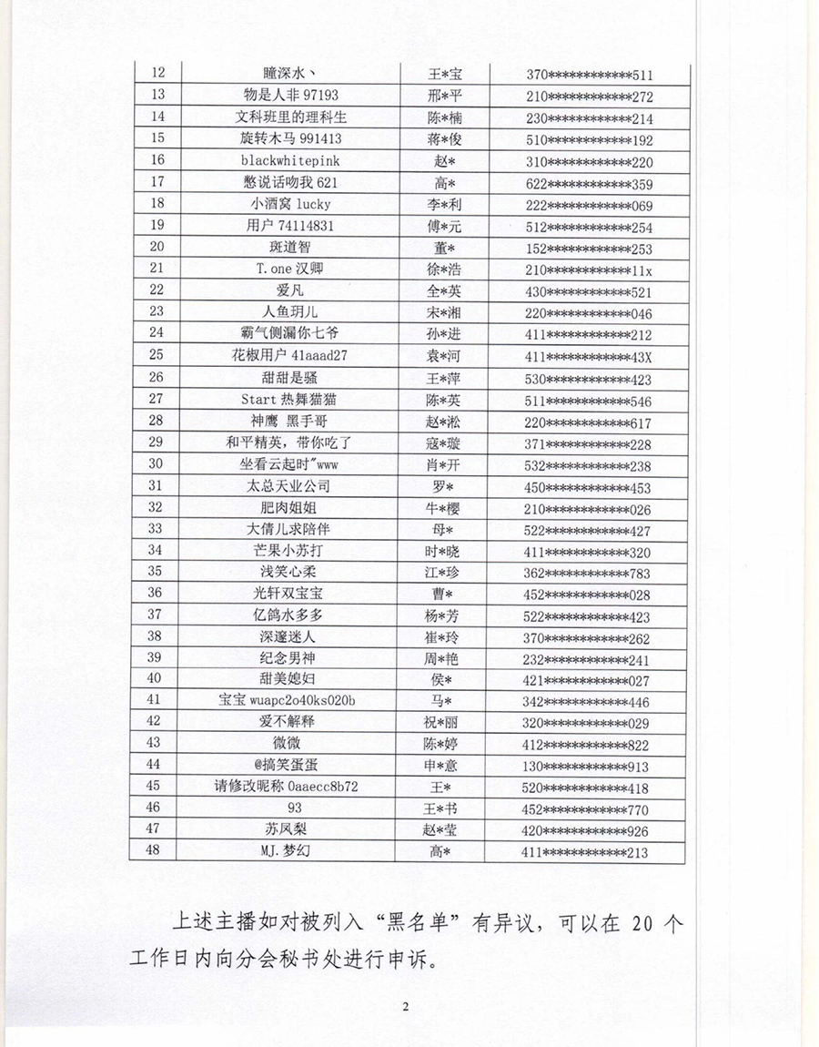 根據《互聯網文化管理暫行規定》《網絡表演經營活動管理辦法》《互聯網直播服務管理規定》等相關法律法規,按照《網絡表演(直播)行業主播“黑名單”管理制度》《黑名單認定工作流程》規定,中國演出行業協會網絡表演(直播)分會現向社會公布第六批主播黑名單,被列入黑名單的主播將在行業內禁止注冊和直播,封禁期限5年。(總臺央視記者 曹巖)
