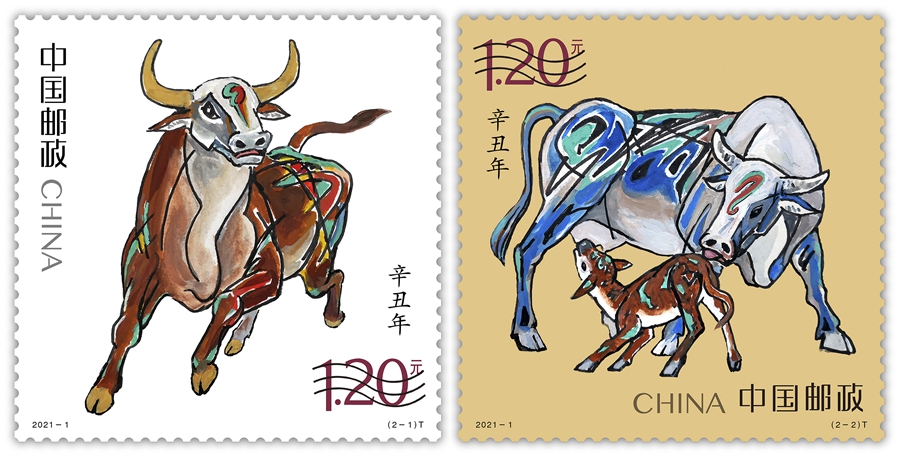 《辛丑年》特種郵票由著名畫家姚鐘華先生創(chuàng)作,延續(xù)了第四輪生肖郵票的“家國”理念。第一枚名為“奮發(fā)圖強(qiáng)”,描繪了雄壯有力、一往無前的奔牛形象。公牛四蹄揚(yáng)起,昂首向前,目光炯炯,表達(dá)出不畏艱險(xiǎn)、砥礪前行,為實(shí)現(xiàn)中華民族偉大復(fù)興而努力奮斗的寓意。第二枚名為“牛年大吉”,通過大牛與小牛舐犢情深的溫馨畫面,向全國人民傳遞家庭興旺和諧、團(tuán)圓美滿的美好祝愿。