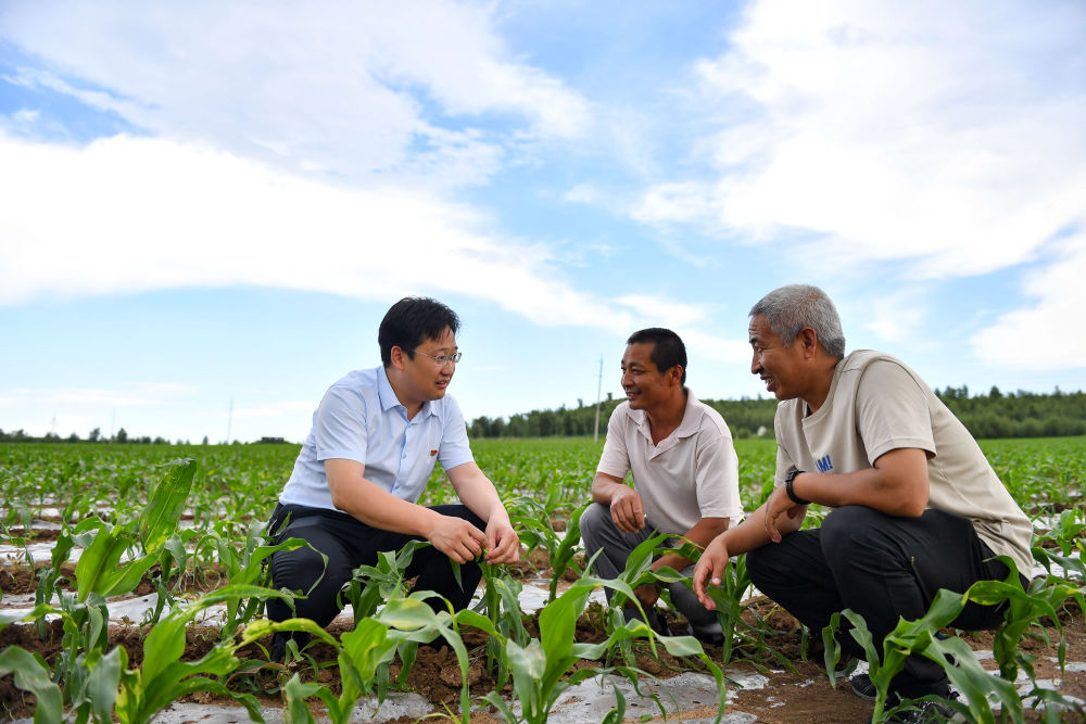 ↑張驊(左)下田了解黑糯玉米生長(zhǎng)情況