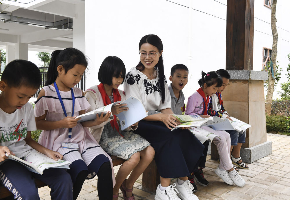 ↑廣東化州教師郭一冰與學(xué)生一起閱讀