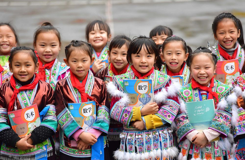 ↑廣西融水苗族自治縣的孩子手捧書(shū)本在校園合影