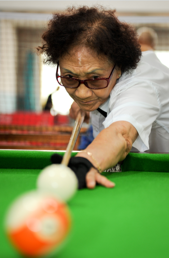 長春市春城街道活動(dòng)中心老人馮化庚在該中心臺(tái)球培訓(xùn)班做示范