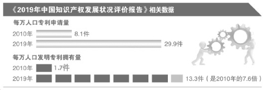 近日,國家知識產權局知識產權發展研究中心發布《2019年中國知識產權發展狀況評價報告》(以下簡稱《報告》)?!秷蟾妗凤@示,從2010年到2019年,每萬人口專利申請量由8.1件增加到29.9件,每萬人口發明專利擁有量在2019年達到13.3件,是2010年的7.6倍;每萬人口商標申請量由7.0件增加到53.3件;每萬人口著作權登記量由3.4件提高到30件。