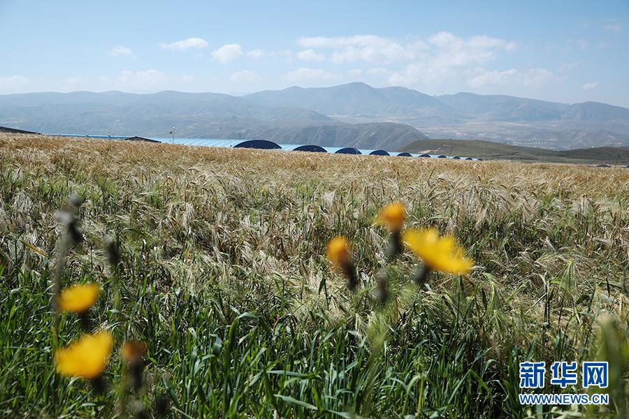 東達村的青稞迎來豐收,遠處藍色頂棚建筑是東達村養殖場。新華網記者焦鵬攝