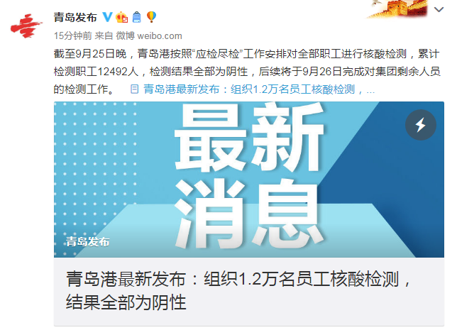 青島港最新發(fā)布:組織1.2萬名員工核酸檢測,結(jié)果全部為陰性