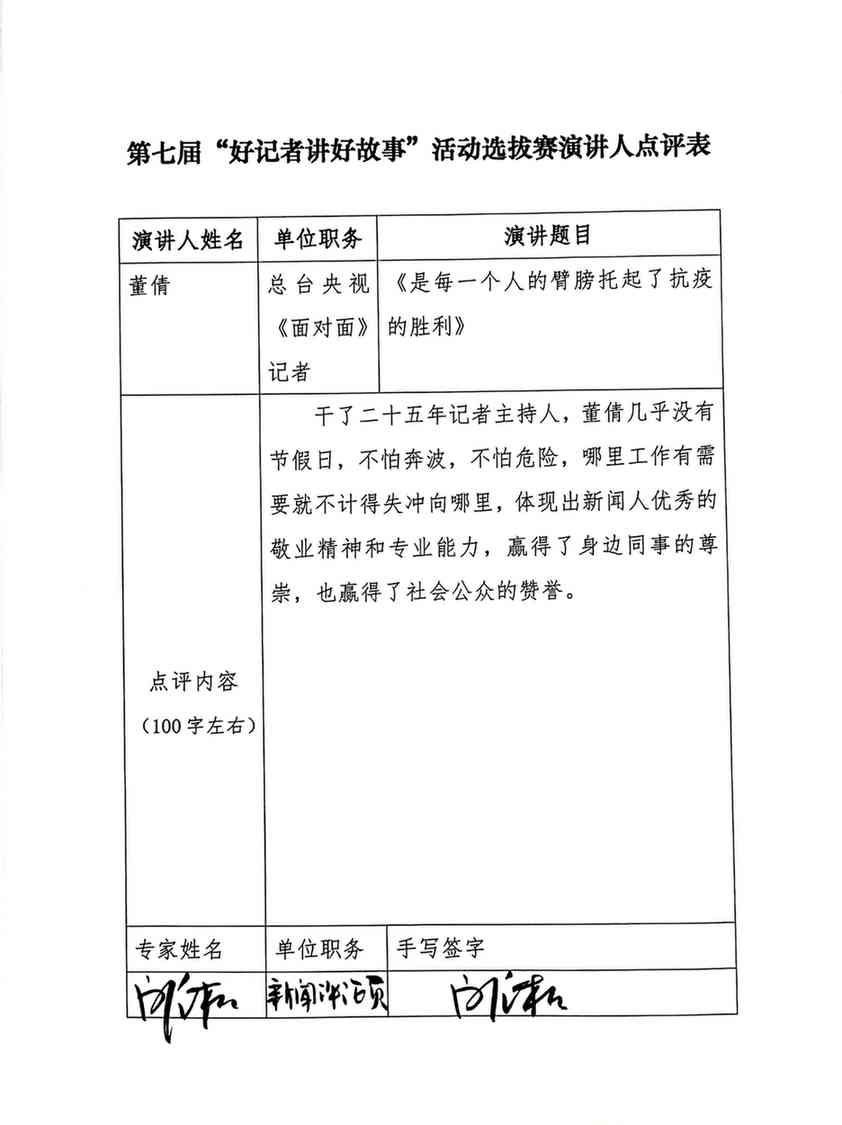 在中央廣播電視總臺武漢新冠肺炎疫情報道團隊里,董倩在記者中年齡最長、資格最老、知名度最高。在武漢的95天,她完成了125期大屏直播、《面對面》訪談和新媒體《武漢觀察》,還主持了40期《武漢直播間》訪談節目。這些來自抗擊疫情一線的全景式報道,社會反響很大,不少節目播出以后點擊量都在上億次,發揮的作用得到中央領導同志充分肯定和社會各界高度評價。期間,除了因接觸到確診患者而必須隔離的4天外,董倩每天都在采訪。腰肌勞損疼得她夜里睡覺無法翻身,眼睛上麥粒腫發炎直流眼淚,她沒有休息過一天。她還不顧個人安危,40多次進入紅區采訪。對于她來說,去哪里采訪的標準只有一個:應不應該去報道,有沒有價值被報道。通過她的采訪,人們認識了身患漸凍癥仍然到處奔波的金銀潭醫院院長張定宇,輾轉三百多公里四天三夜返回崗位的90后女孩甘如意,以志愿者身份搞定醫護人員生活難題的快遞小哥汪勇,主動請纓實施第一例新冠肺炎逝者遺體解剖的法醫劉良……面對武昌醫院殉職院長劉智明的妻子蔡利萍時,董倩強忍淚水,握著對方的手給予慰藉;72歲的中醫大家張伯禮流著眼淚對董倩說:你太會問了!在全國抗擊新冠肺炎疫情表彰中,董倩被授予“全國抗擊新冠肺炎疫情先進個人”稱號。