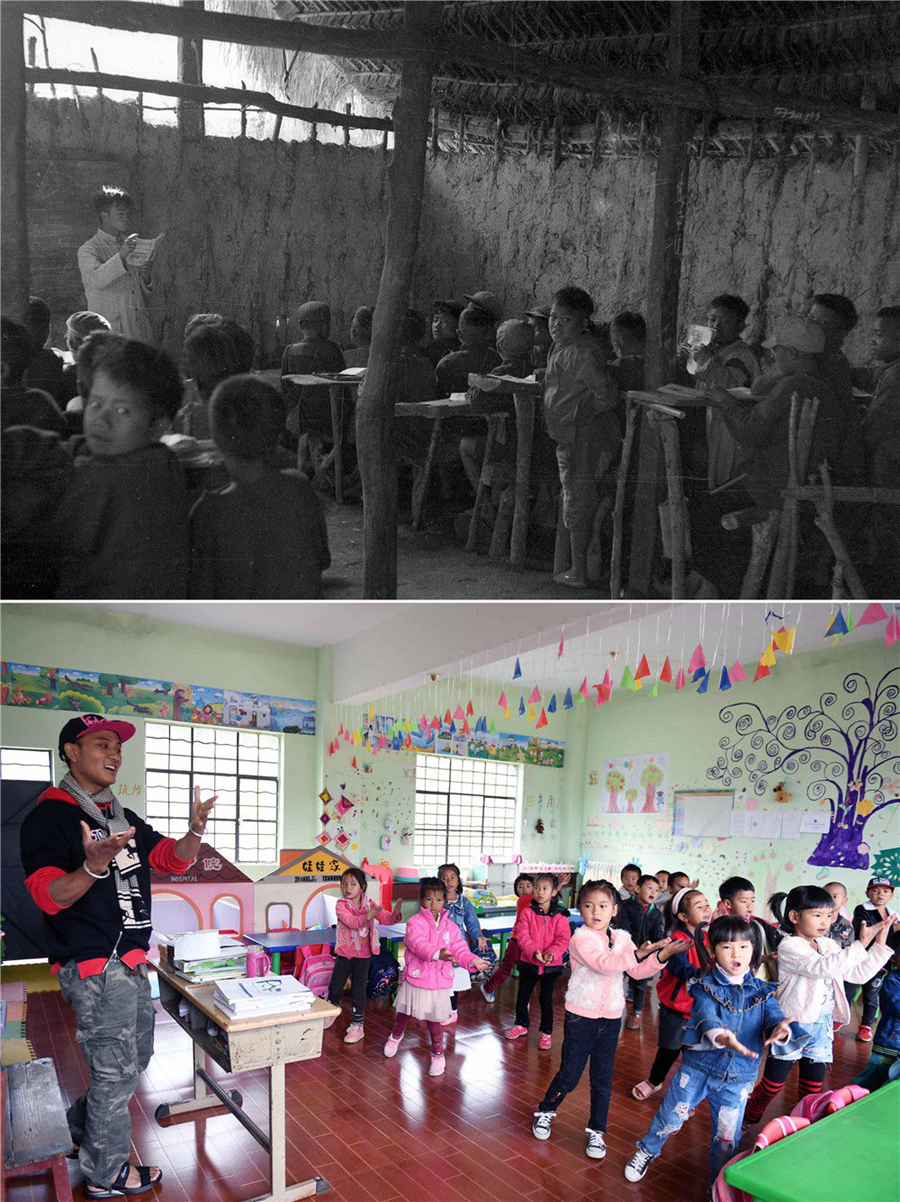 拼版照片:上圖為1954年,在云南省普洱市西盟佤族自治縣創辦的第一所小學——西盟小學,老師帶領孩子讀書學習(資料照片);下圖為2018年12月7日,云南省普洱市西盟佤族自治縣勐梭鎮班母村佤山育忠幼兒園的孩子跟著老師巖科上音樂課。1986年出生的巖科是班母村佤族寨人。他說,我的阿媽小時候沒有進過一天學堂,現在,佤山的孩子們都在寬敞明亮的教室里學習(新華社記者楊宗友攝)。新華社發