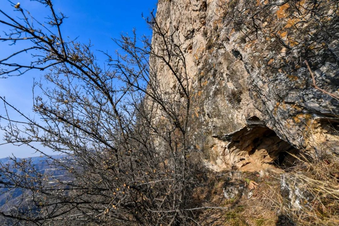 這次3個老鄉(xiāng)帶路,換路而行。路程明顯縮短,但卻十分陡峭。有的石階僅容一只腳,兩只手也只能扒著峭壁,而身后就是懸崖。攀爬一個多小時后,一個山洞映入眼簾。