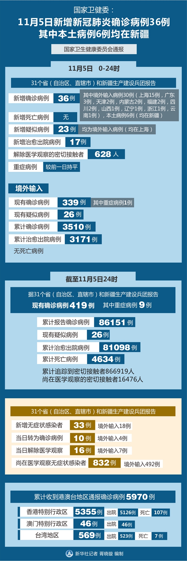 新華社北京11月6日電? 國(guó)家衛(wèi)生健康委員會(huì)6日通報(bào),11月5日0-24時(shí),31個(gè)省(自治區(qū)、直轄市)和新疆生產(chǎn)建設(shè)兵團(tuán)報(bào)告新增新冠肺炎確診病例36例,其中境外輸入病例30例(上海15例,廣東3例,天津2例,內(nèi)蒙古2例,福建2例,四川2例,山西1例,遼寧1例,浙江1例,云南1例),本土病例6例(均在新疆);無(wú)新增死亡病例;新增疑似病例23例,均為境外輸入病例(均在上海)。