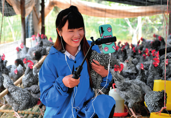 陜西省商洛市丹鳳縣寺坪鎮(zhèn)寺坪村村民李萌在自家雞棚里網(wǎng)絡直播賣貨(9月10日攝) 劉瀟攝