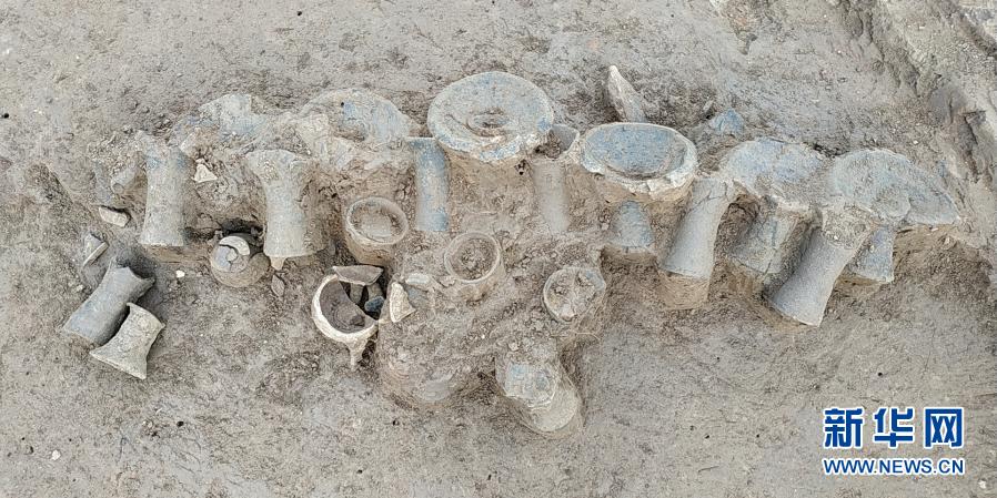 圖為河南葉縣余莊遺址標(biāo)號(hào)為T0405的探方出土的陶器,該組陶器擺放有序,呈現(xiàn)出鮮明的禮制色彩(11月3日攝)。新華社發(fā)(河南省文物考古研究院供圖)