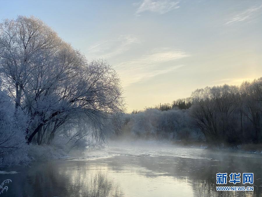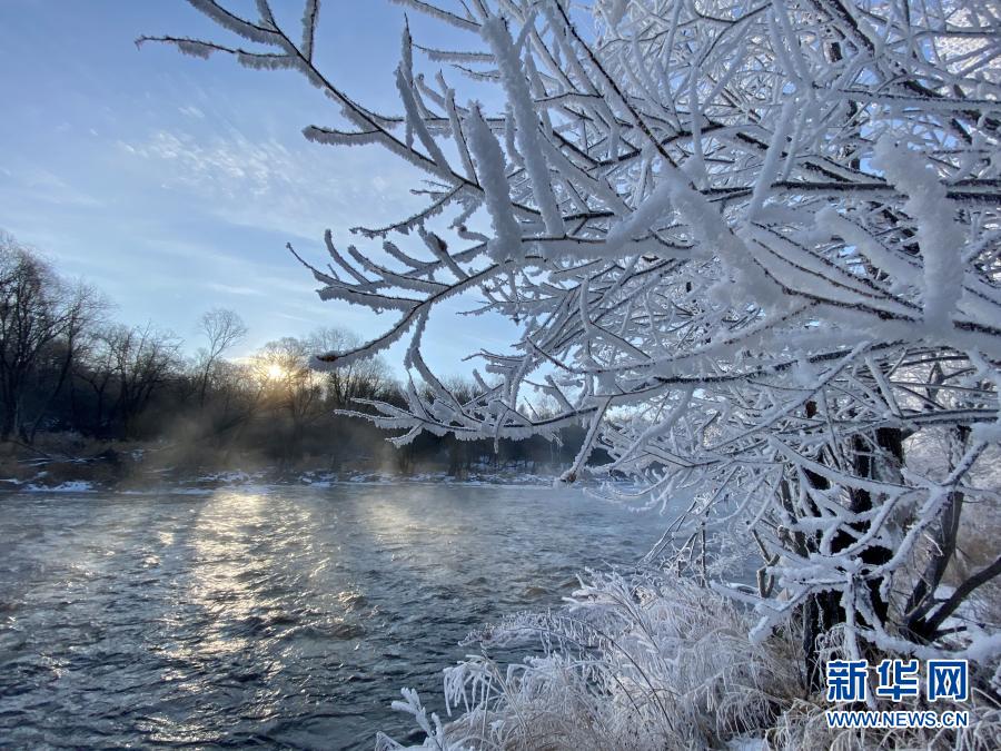 遜克縣位于黑龍江省北部,冬季漫長而寒冷。當地庫爾濱水電站放水時,水遇冷形成霧氣,落到樹枝上凝結成霜花,在平臺村周邊形成綿延的霧凇景觀。