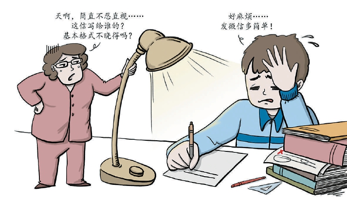 齊齊從小學(xué)一年級(jí)就開始練習(xí)毛筆字,如今已經(jīng)能寫出很不錯(cuò)的行書,但他也從不寫信,“有必要嗎?”齊齊說,父母要求他每個(gè)月要給遠(yuǎn)在老家的祖父母、外祖父母打電話,每次電話的通話時(shí)間也就兩三分鐘,“我爸他們也就是問奶奶吃飯了沒,多買點(diǎn)吃的,不舒服趕緊去醫(yī)院……就這幾句話,真沒營(yíng)養(yǎng)。”