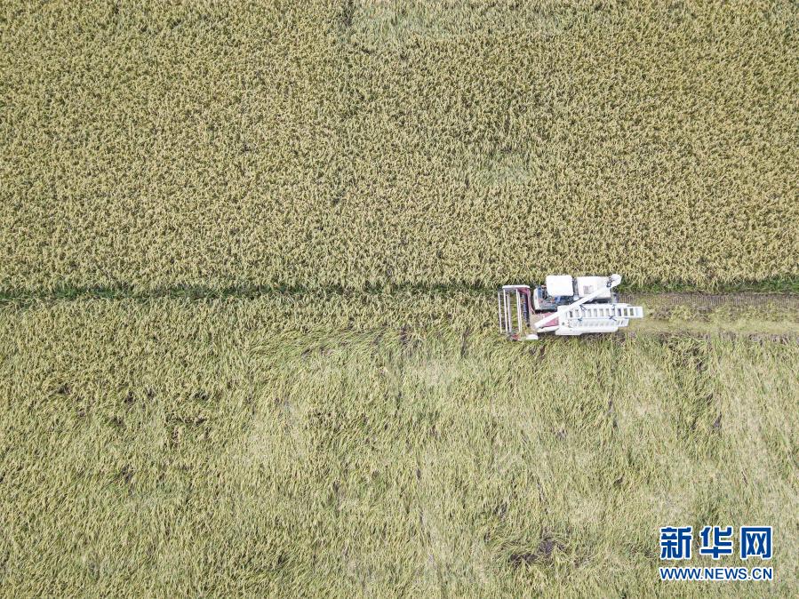 10月22日,工作人員駕駛收割機在海南海口龍華區龍泉鎮新江村收割晚稻(無人機照片)。