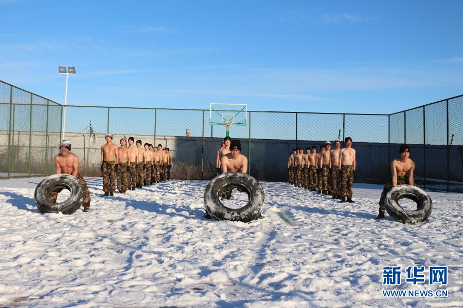 武警黑龍江總隊黑河支隊官兵冒著零下20攝氏度嚴寒在雪中開展翻輪胎訓練(12月10日攝)。新華社發(李響 攝)